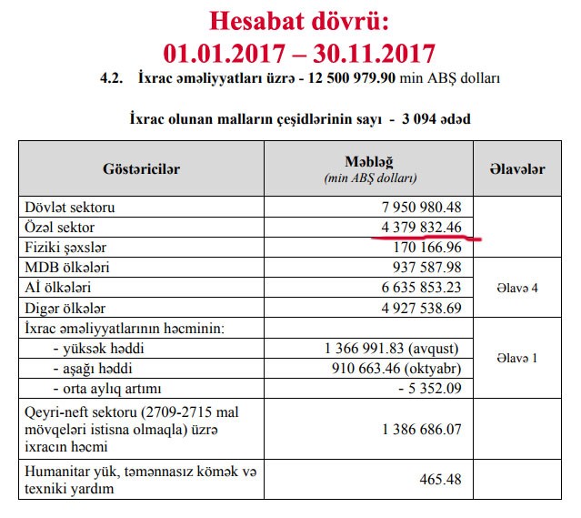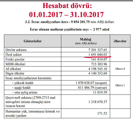 "Marja" Dövlət Gömrük Komitəsinə istinadən xəbər verir ki, 2017-ci ilin 10 ayı ərzində Azərbaycanın özəl sektorunun ixracı 1 milyard 691 milyon dollar təşkil etmişdi. Komitənin 2017-ci ilin 11 ayı üzrə açıqladığı statistikasında isə göstərilir ki, özəl sektorun ixracı təxminən 4 milyard 380 milyon dollar təşkil edib. Yəni, özəl sektor Noyabrda ixracını 2 milyard 689 milyon dollar artırıb.