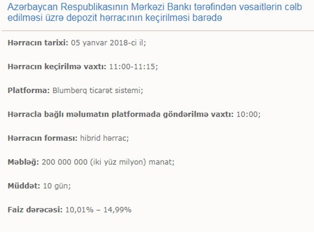 Mərkəzi Bankdan "Marja"ya bildirildi ki, təşkil olunan depozit hərraclarının şərtlərində o cümlədən müddətləri ilə bağlı heç bir dəyişiklik yoxdur. Yeni il ilə bağlı qeyri-iş günləri ilə əlaqədar yalnız 5 yanvar tarixində keçiriləcək hərracın müddəti 10 gün müəyyən edilmişdir.