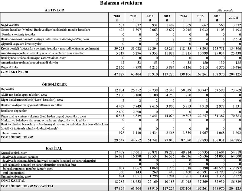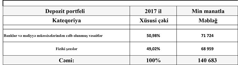 “NBC Bank”da depozitlər 2016-cı ilin sonundakı 67 milyon 598 min manatdan 2017-ci ilin sonunda 73 milyon 969 min manata qalxıb.
