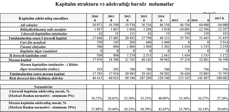 “NBC Bank”ın məcmu kapitalı 2016-cı ilin sonundakı 52 milyon 5 min manatdan 2017-ci ilin sonunda 55 milyon 795 min manata yüksəlib.