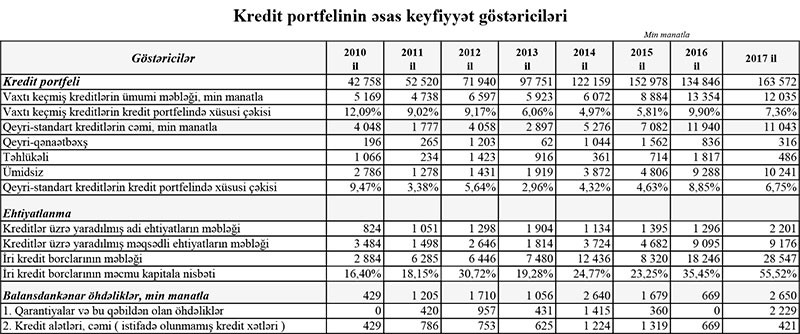 Bankın kredit portfeli (müştərilərə verilmiş kreditlər - məqsədli ehtiyatlar çıxılmaqla) 2016-cı ilin sonundakı 125 milyon 751 min manatdan 154 milyon 396 min manata yüksəlib. “NBC Bank”da vaxtı keçmiş kreditlər 13 milyon 354 min manatdan 12 milyon 35 min manata düşüb. Vaxtı keçmiş kreditlərin ehtiyatlar daxil kredit portfelində xüsusi çəkisi 9,90%-dən 7,36%-ə geriləyib.