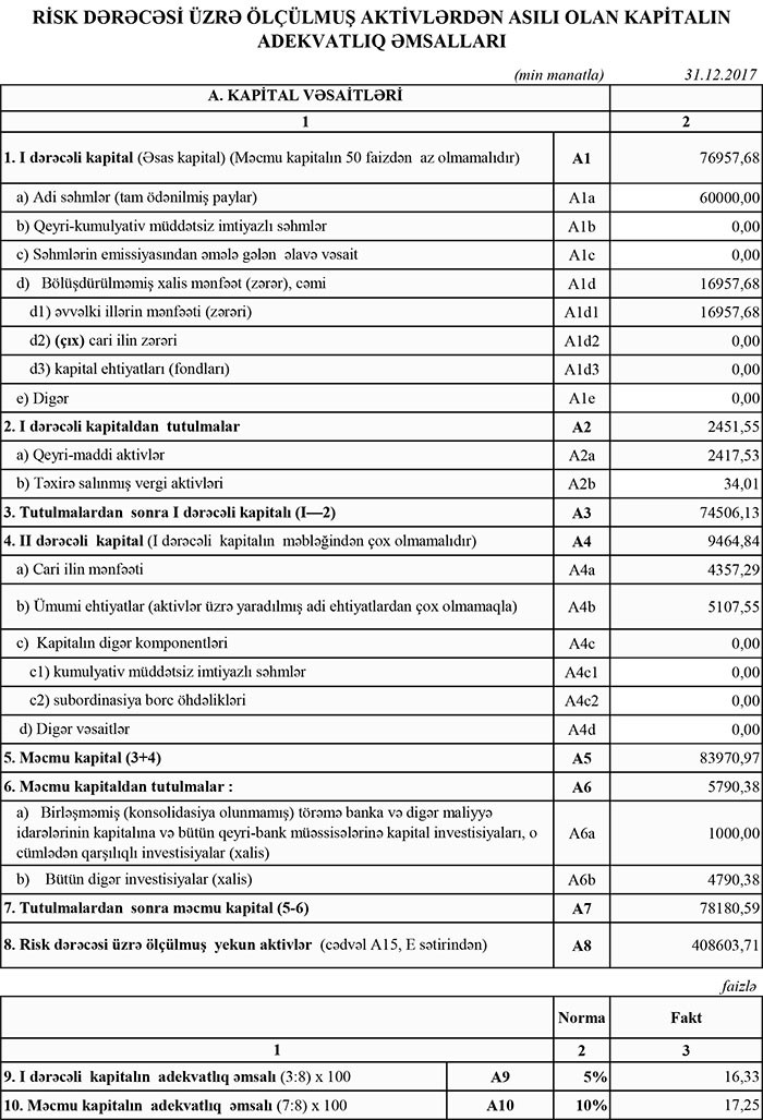2016-cı ildə aktivlər üzrə mümkün zərərlərin ödənilməsi üçün xüsusi ehtiyatın yaradılmasına 3 milyon 589 min manat ayıran bank, 2017-cı ildə bu məqsədlə 1 milyon 354 min manat ayırıb.