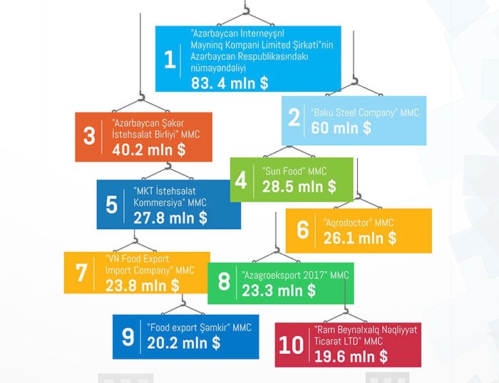 “İxrac İcmalı”nın son sayında qeyri-neft sektoru üzrə əsas ixracatçı şirkətlərin reytinqi verilib. 2017-ci ildə qeyri-neft sektoru üzrə qeyri-dövlət ixracatçı şirkətlərin siyahısında ilk onluqda “Azərbaycan İnterneyşnl Mayninq Kompani Limited Şirkəti”nin Azərbaycan Respublikasındakı nümayəndəliyi (83,4 mln $), “Baku Steel Company” MMC (60 mln $), “Azərbaycan Şəkər İstehsalat Birliyi” MMC (40.2 mln $), “Sun Food” MMC (28.5 mln $), “MKT İstehsalat Kommersiya” MMC (27.8 mln $), "Aqrodoctor" MMC (26.1 mln $), "VN Food Export Import Company" MMC (23.8 mln $), "Azagroeksport 2017" MMC ( 23.3 mln $), “Food Export Şəmkir” MMC (20.2 mln $) və “Ram Beynəlxalq Nəqliyyat və Ticarət LTD” MMC (19.6 mln $) təmsil olunub.