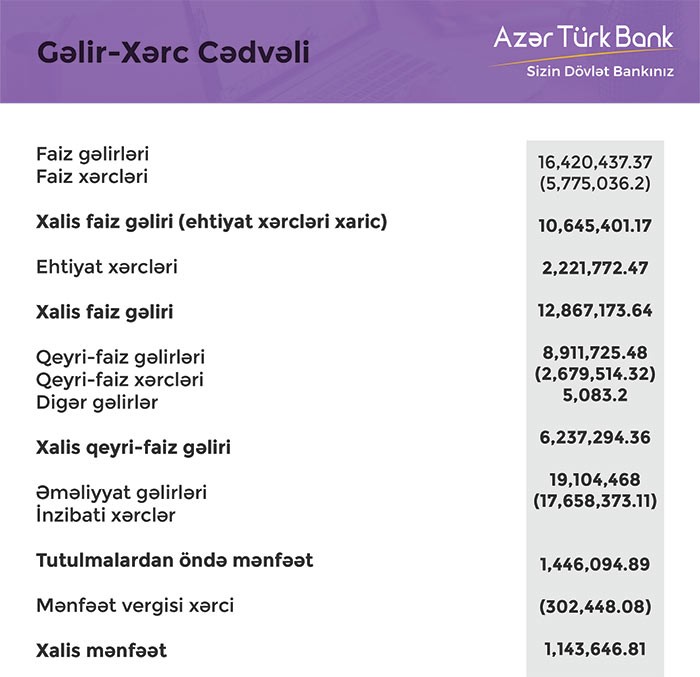“AzərTürkBank” ASC 2017-ci ili 1 milyon 144 min manat xalis mənfəətlə başa vurub.