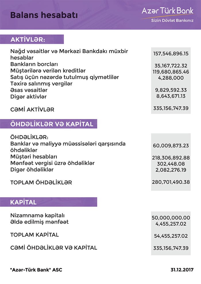 31 Dekabr 2017-ci il tarixində “AzərTürkBank” 335 milyon 156 min manat cəmi aktivlərə, 280 milyon 701 min manat cəmi öhdəliklərə və 54 milyon 455 min manat cəmi balans kapitalına malik olub.