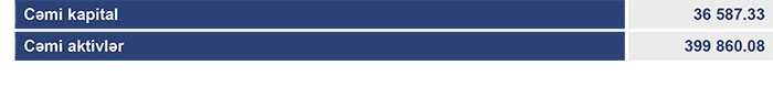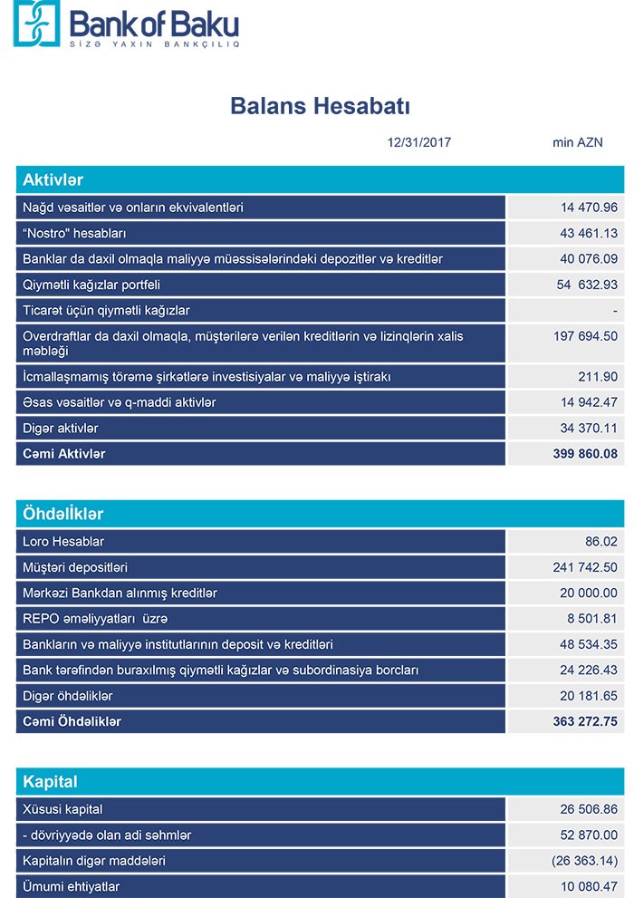 “Bank of Baku” 31 Dekabr 2017-ci il tarixində 399 milyon 860 min manat cəmi aktivlərə, 363 milyon 272 min manat cəmi öhdəliklərə və 36 milyon 587 min manat cəmi balans kapitalına malik olub.