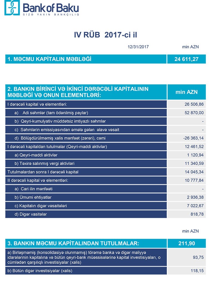 31 Dekabr 2017-ci il tarixində "Bank of Baku"nun məcmu kapitalı 24 milyon 611 min manat təşkil edib. 2016-cı ilin sonunda Bank 82 milyon 706 min manat məcmu kapitala malik idi.