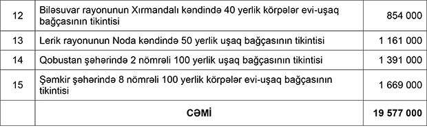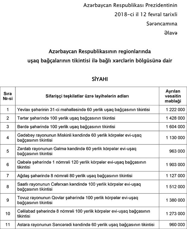 Sərəncam ilə, 306 mindən çox olan 15 şəhər və rayonda ümumilikdə 1230 yerlik 15 uşaq bağçasının tikintisi məqsədi ilə Azərbaycan Respublikası Prezidentinin 2018-ci il 22 yanvar tarixli 3593 nömrəli Sərəncamı ilə təsdiq edilmiş “Azərbaycan Respublikasının 2018-ci il dövlət büdcəsində dövlət əsaslı vəsait qoyuluşu (investisiya xərcləri) üçün nəzərdə tutulan vəsaitin bölgüsü”nün 1.43.7-ci yarımbəndində göstərilmiş məbləğin 19 577 000 (on doqquz milyon beş yüz yetmiş yeddi min) manatı Azərbaycan Respublikası Ərazilərinin Bərpası və Yenidən Qurulması üzrə Agentliyə ayrılsın.