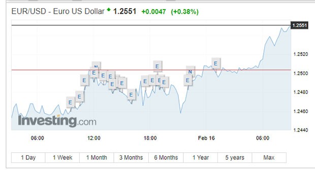 "Marja" xəbər verir ki, dünən 1.25 səviyyəsini keçən Avro/dollar məzənnəsi bu gün səhər 1.2551 səviyyəsinə qalxıb (Bakı vaxtı ilə saat 09:10-a olan məlumat). Məzənnə 25 Yanvarda qalxdığı ilin ən yüksək səviyyəsi olan 1.2537-ni də keçib.