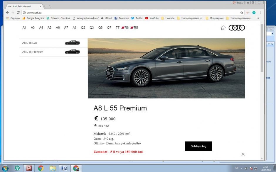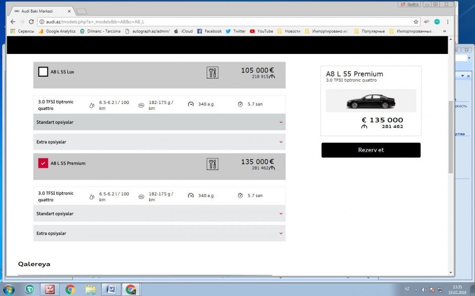 Bunun üçün əsas menyuda olan “A8” yazısına tıqqıldatmaq kifayət edir. Açılan növbəti səhifədə yeni nəsil flaqman modelinin iki təchizat səviyyəsində - A8 L 55 Lux və A8 L 55 Premuim, - təklif edildiyini görürük. Bu o deməkdir ki, konfiquratora girib, avtomobilinizin təchizatını sərbəst şəkildə yığmağa tənbəllik edirsiniz isə, üstəlik sifariş etdiyiniz üç ay gözləməyə hövsələniz çatmırsa, dilerin sizin üçün yığdığı modelə nəzər sala bilrəsiniz.