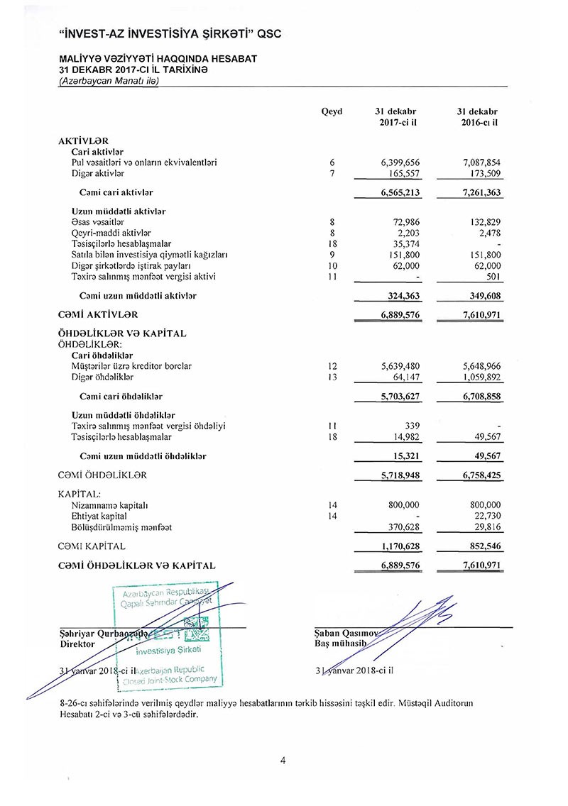31 Dekabr 2017-ci il tarixində “İnvest-AZ” 6 milyon 890 min manat cəmi aktivlərə, 1 milyon 171 min manat cəmi kapitala və 5 milyon 719 min manat cəmi öhdəliklərə malik olub.