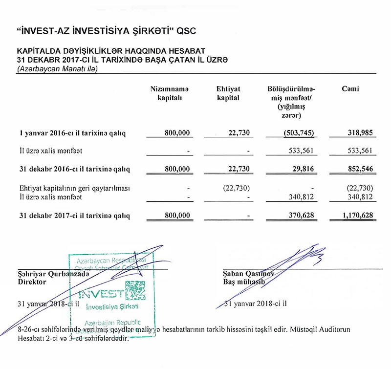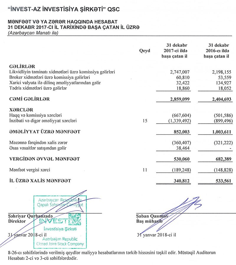Bütün xərclər çıxıldıqdan sonra “İnvest-AZ”ın 530 min manat mənfəəti qalıb. Bu mənfəətdən 189,2 min manat mənfəət vergisi ödənilib. Nəticədə şirkət ötən ili 340 min 812 manat xalis mənfəətlə bağlayıb.
