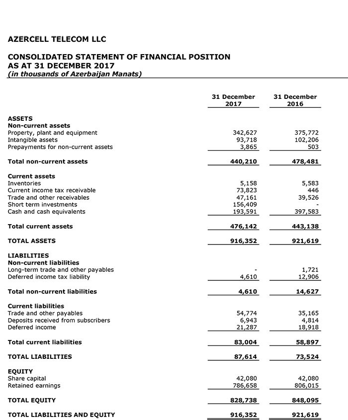 31 Dekabr 2017-ci il tarixində “Azercell Telekom” 916 milyon 352 min manat cəmi aktivlərə, 87 milyon 614 min manat cəmi öhdəliklərə və 828 milyon 738 min manat cəmi kapitala malik olub.
