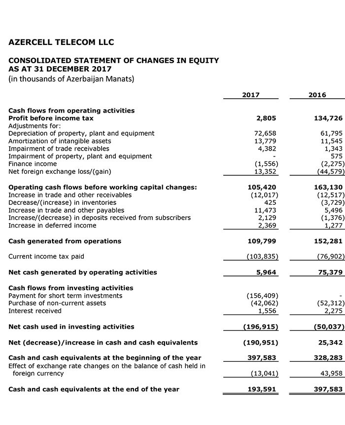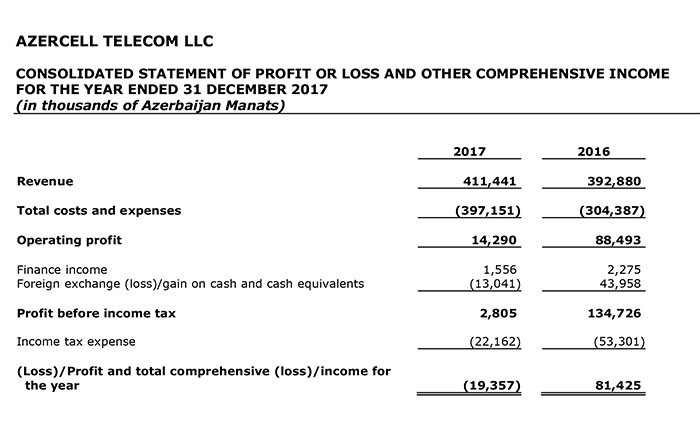 Belə ki, şirkətin cəmi gəlirləri 2016-cı ildəki 392 milyon 880 min manatdan 2017-də 411 milyon 441 min manata, xərcləri isə 304 milyon 387 min manatdan 397 milyon 151 min manata yüksəlib. Xərclər çıxıldıqdan sonra Azercell-in 14 milyon 290 min manat əməliyyat mənfəəti qalıb. Lakin valyutaların məzənnələrinin dəyişməsi nəticəsində şirkət 13 milyon 41 min manat zərər etdiyindən mənfəəti 2 milyon 805 min manata düşüb. 22 milyon 162 min manat mənfəət vergisi xərcinə görə, “Azercell Telekom” ötən ili 19 milyon 357 min manat zərər ilə bağlayıb.