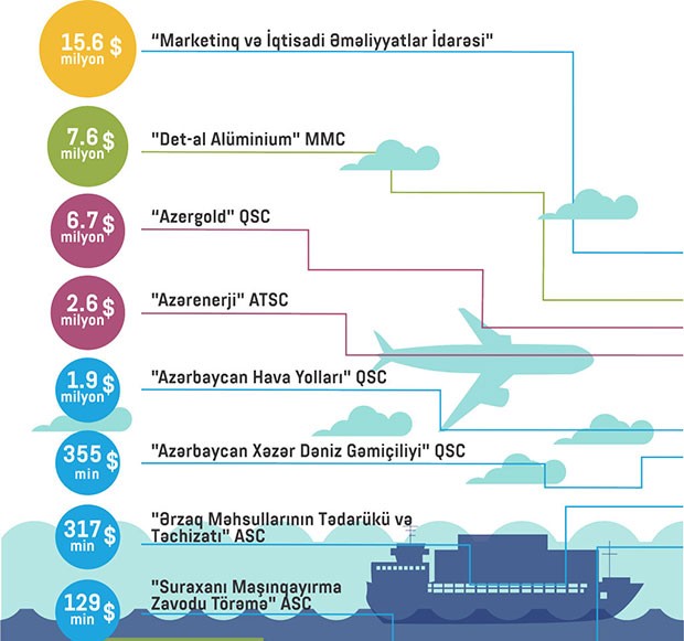 Qeyri-neft sektoru üzrə ixrac əməliyyatlarında iştirak edən dövlətə məxsus şirkətlərin siyahısında isə 8 şirkət fərqlənib. Bunlar ARDNŞ-in “Marketinq və İqtisadi Əməliyyatlar İdarəsi”, “Det-al Alüminium” MMC, “Azergold” QSC, “Azərenerji” ASC, "Azərbaycan Hava Yolları" QSC, "Azərbaycan Xəzər Dəniz Gəmiçiliyi" QSC, "Ərzaq Məhsullarının Tədarükü və Təchizatı" ASC, "Suraxanı Maşınqayırma Zavodu Törəmə" ASC-dir.