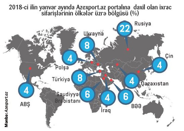 2018-ci ilin yanvar ayında portala daxil olan ixrac sifarişlərinin ilk beşliyində Rusiya (22 %), Türkiyə (8%), Ukrayna (8%), Səudiyyə Ərəbistanı (6%) və Birləşmiş Ərəb Əmirlikləri (6%) qərarlaşıb.