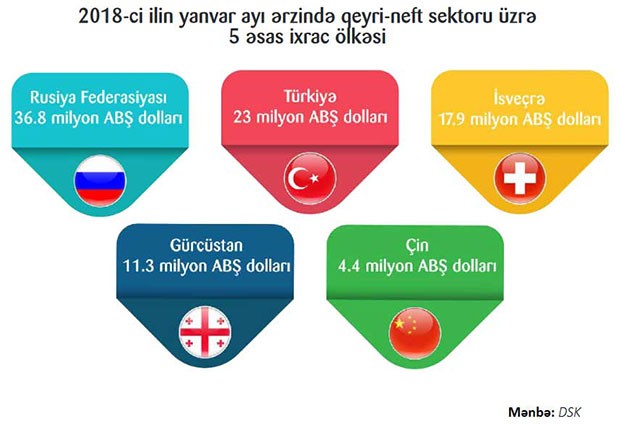 İcmalın bu sayında göstərilir ki, 2018-ci ilin yanvar ayı ərzində qeyri-neft sektoru üzrə ixrac 123 milyon ABŞ dolları təşkil edib. 2017-ci ilin müvafiq dövrü ilə müqayisədə bu ilin yanvar ayında qeyri-neft sektoru üzrə ixrac 1/3 həcmdə artıb. Dövlət Statistika Komitəsinin məlumatına əsasən ilin ilk ayı ərzində ən çox qeyri-neft məhsulları Rusiya Federasiyasına ixrac edilib (36.8 milyon ABŞ dolları). Yanvar ayı ərzində Türkiyəyə 23 milyon, İsveçrəyə 17,9 milyon, Gürcüstana 11.3 milyon və Çinə 4.4 milyon ABŞ dolları dəyərində qeyri-neft sektoruna aid mal ixrac olunub.