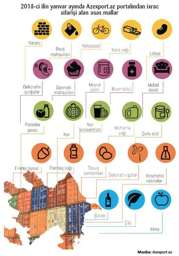 Daxil olan sifarişləri məhsullar üzrə təhlil etdikdə məlum olub ki, cari ilin yanvar ayında ən çox ixrac sifarişi şərab, çay, fındıq ləpəsi, pomidor şirəsi, nar, nar konsentratı və alma olub. Həmçinin lobya, toyuq yumurtası, dekorativ güllər, kosmetik vasitələr, quru süd, dekorativ qurğular, qənnadı məhsulları, meyvə cemi, biyan kökü, mebel dəsti, mühərrik yağı, velosiped, pambıq yağı, boya məhsulları, pambıq toxumu (çiyid), kərpici və s. mallara da sifariş daxil olub.