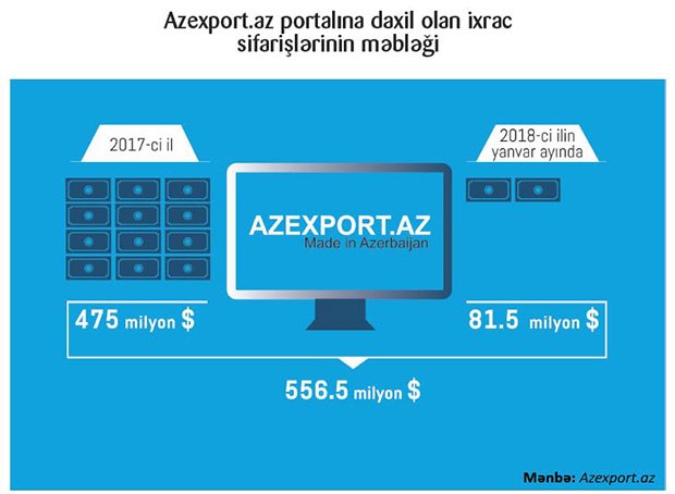 “İxrac İcmalı”nda 2018-ci ilin yanvar ayı ərzində Azexport.az portalına daxil olan ixrac sifarişləri barədə də məlumat verilib. Göstərilib ki, 2018-ci ilin yanvar ayı ərzində Azexport.az portalına 81.5 milyon ABŞ dolları məbləğində ixrac sifarişləri daxil olub. Ümumilikdə isə 2017-ci ilin 01 yanvar tarixindən 2018-ci ilin 31 yanvar tarixinə kimi Azexport.az portalına dünyanın 78 ölkəsindən daxil olan ixrac sifarişlərinin dəyəri 556.6 milyon ABŞ dolları təşkil edib.