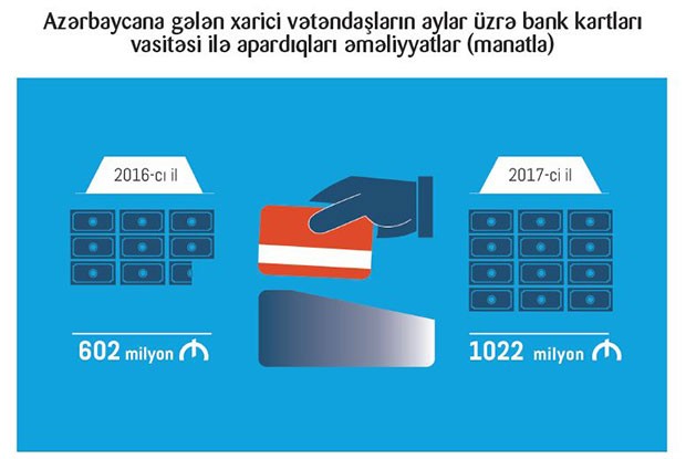 İİTKM-in departament rəhbəri Ramil Hüseyn bildirir ki, 2016-cı illə müqayisədə 2017-ci ildə Azərbaycana gələn xarici vətəndaşların aylar üzrə bank kartları vasitəsi ilə apardıqları əməliyyatların dəyəri 70 faiz artaraq 1 milyard 22 milyon manat təşkil edib.