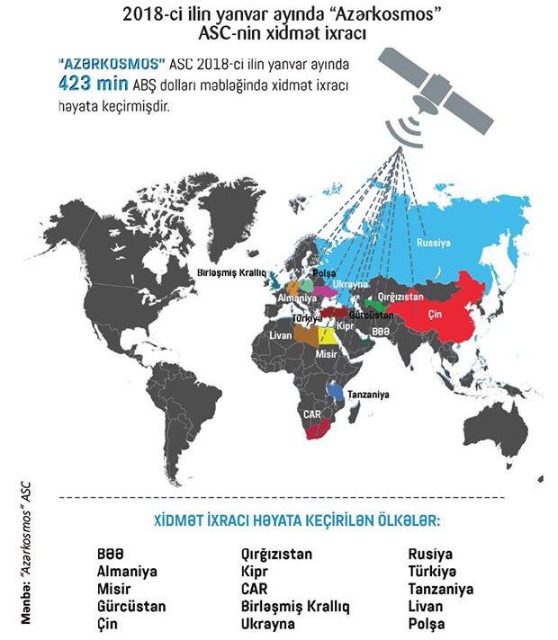“İxrac İcmalı”nda həm də xidmət ixracına yer ayrılıb. Göstərilib ki, 2018-ci ilin yanvar ayında “Azərkosmos” ASC tərəfindən dünyanın 15 ölkəsinə peyk telekommunikasiya xidmətləri ixrac edilib. Cari ilin ilk ayında “Azərkosmos” ASC peyk telekommunikasiya xidmətlərininin (Azerspace-1) ixracından 423 min ABŞ dolları məbləğində gəlir əldə edilib. “Azərkosmos” ASC-nin 2018-ci ilin yanvar ayında xidmət ixracı əsasən BƏƏ, Almaniya, Misir, Gürcüstan, Çin, Qırğızıstan, Kipr, CAR, Birləşmiş Krallıq, Ukrayna və digər ölkələrə olub.