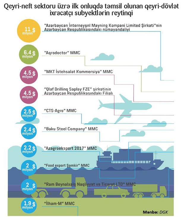 “İxrac İcmalı”nın fevral sayında qeyri-neft sektoru üzrə əsas ixracatçı şirkətlərin də reytinqi verilib. 2018-ci ilin yanvar ayında qeyri-neft sektoru üzrə qeyri-dövlət ixracatçı şirkətlərin siyahısında ilk onluqda “Azərbaycan İnterneyşnl Mayninq Kompani Limited Şirkəti”nin Azərbaycan Respublikasındakı nümayəndəliyi, “"Aqrodoctor" MMC, "MKT İstehsalat Kommersiya" MMC, “Qlaf Drillinq Saplay FZE” şirkətinin Azərbaycan Respublikasındakı Filialı, “CTS-Agro” MMC, "Baku Steel Company" MMC, "Azagroeksport 2017" MMC, "Food export Şəmkir" MMC, "Ram Beynəlxalq Nəqliyyat və Ticarət LTD" MMC və “İlham-M” MMC təmsil olunub.