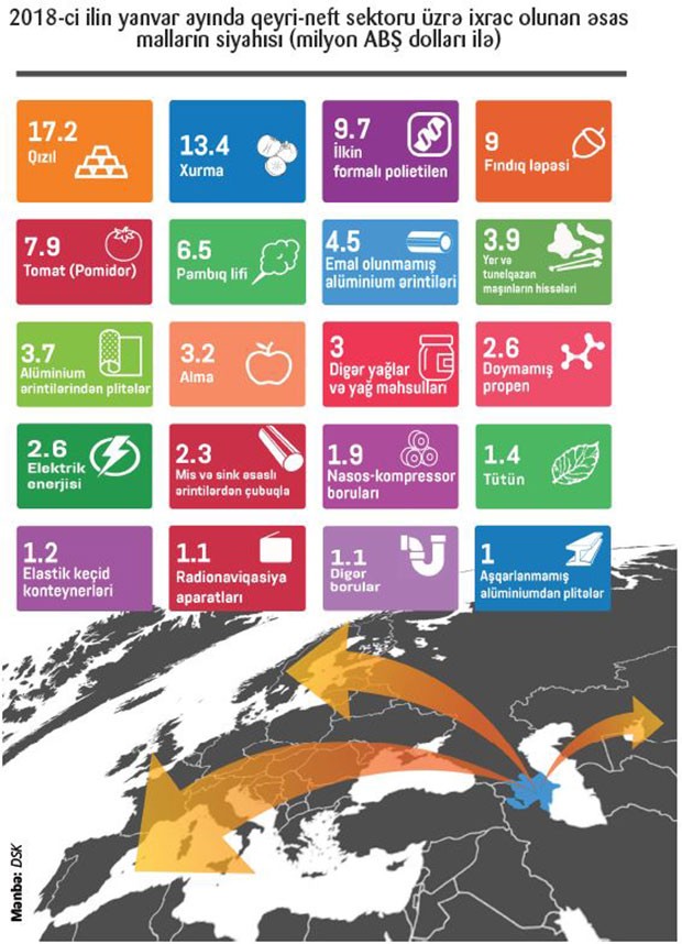 2018-ci ilin yanvar ayı ərzində ixrac olunan qeyri-neft sektoru məhsulları arasında qızıl (sikkə kəsilməsində istifadə olunmayan, digər emal olunmamış formalarda) birinci yerdə qərarlaşıb (17 milyon ABŞ dolları). Bu siyahıda ikinci yeri xurma (13 milyon ABŞ dolları), üçüncü yeri isə xüsusi kütləsi 0,94-dən az olan ilkin formalı polietilen (9.7 milyon ABŞ dolları) tutub.