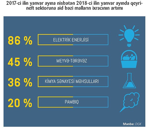 Qeyd edək ki, 2017-ci ilin müvafiq dövrü ilə müqayisədə 2018-ci ilin yanvar ayında elektrik enerjisinin ixracı 86 faiz, meyvə-tərəvəzin ixracı 45 faiz, kimya sənayesi məhsullarının ixracı 36 faiz, pambıq ixracı 20 faiz artıb.