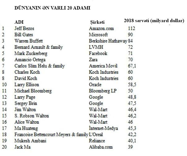 "Marja" xəbər verir ki, siyahıda birinci yeri 112 milyard dollarla Amazon-un qurucusu Cef Bezos tutub.