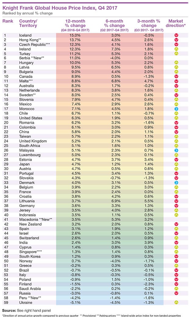 "Marja" hesabata istinadən xəbər verir ki, siyahıda ilk 10 yerdən 7-sini Avropa ölkəsi tutub. Dünya üzrə mənzil qiymətlərinin ən çox artdığı ölkə 15%-lə İslandiyadır. İslandiyanın ardınca 13.7%-lik artımla Honq Konq, 12.3%-lə Çexiya, 12.3%-lə İrlandiya və 11.2%-lə Türkiyə gəlir.