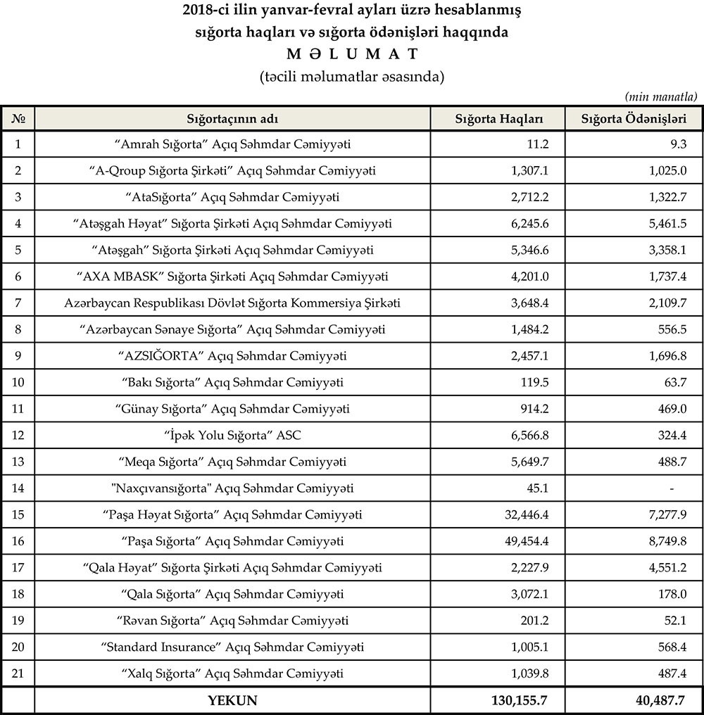 2018-ci ilin yanvar-fevral ayları ərzində ölkədə fəaliyyət göstərən 21 sığorta şirkəti tərəfindən topanmış sığorta haqları
