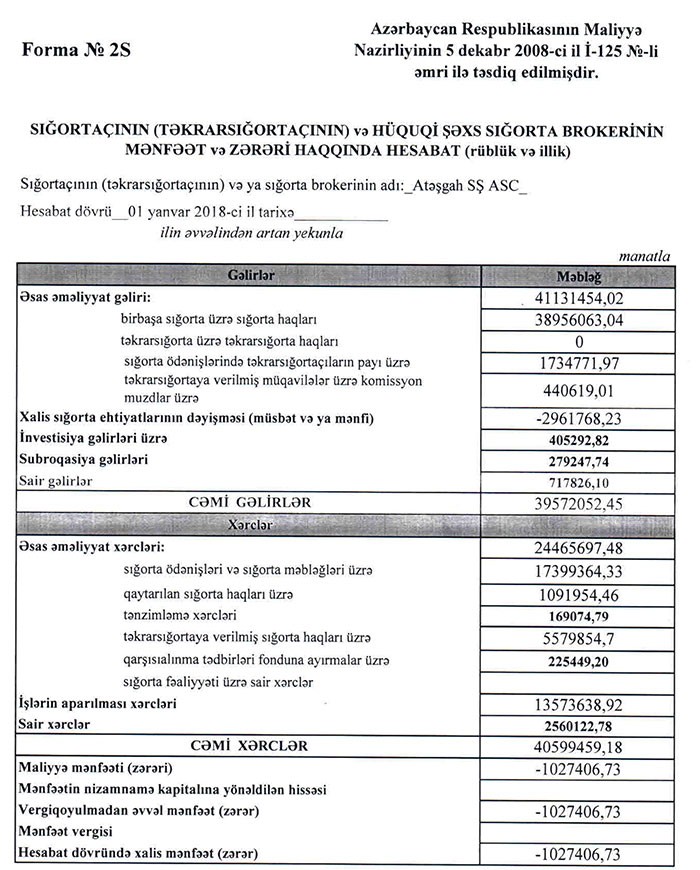 “Atəşgah Sığorta Şirkəti” ASC 2017-ci ili 1 milyon 274 min manat zərər ilə başa vurub. Halbuki şirkət, 2016-cı ili 356,7 min manat xalis mənfəətlə bağlamışdı.