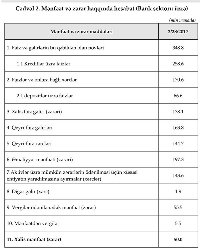 Bankların qeyri-faiz gəlirləri də azalıb. 2017-ci ilin ilk 2 ayında bankların qeyri-faiz gəlirləri 163.8 milyon manat ikən, 2018-ci ilin ilk 2 ayında 70,7 miyon manat təşkil edib.