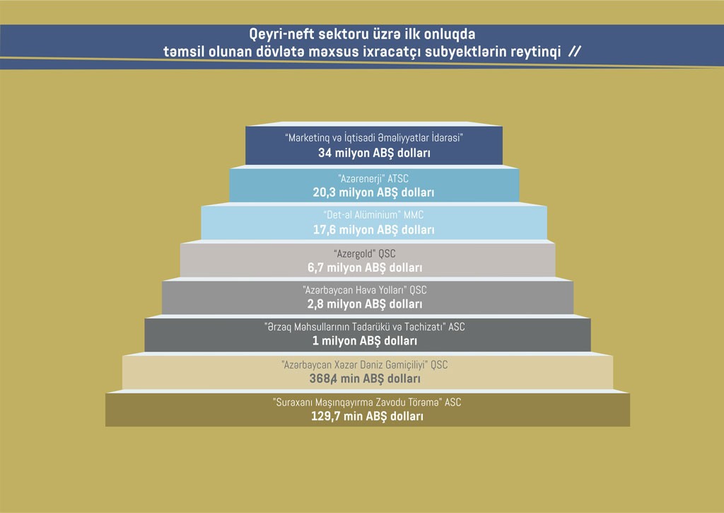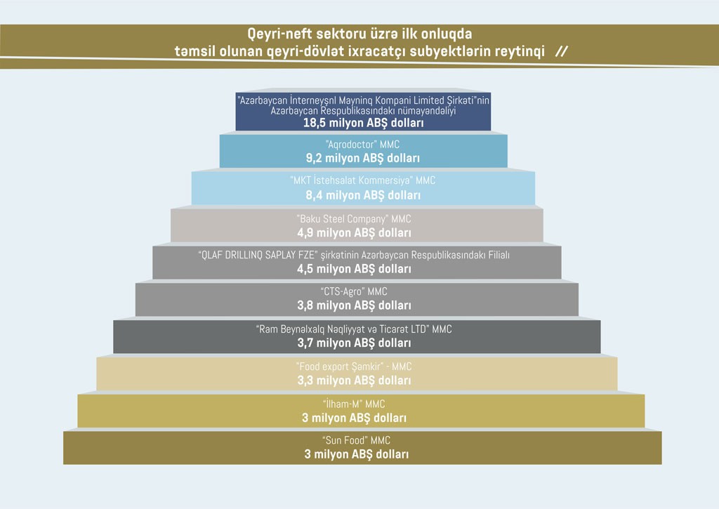 2018-ci ilin yanvar - fevral aylarında qeyri-neft sektoru üzrə qeyri-dövlət ixracatçı şirkətlərin siyahısında ilk onluqda “Azərbaycan İnterneyşnl Mayninq Kompani Limited Şirkəti”nin Azərbaycan Respublikasındakı nümayəndəliyi,“Aqrodoctor" MMC, "MKT İstehsalat Kommersiya" MMC, "Baku Steel Company" MMC, “Qlaf Drillinq Saplay FZE” şirkətinin Azərbaycan Respublikasındakı Filialı, “CTS-Agro” MMC, Ram Beynəlxalq Nəqliyyat və Ticarət LTD" MMC, "Food export Şəmkir", “İlham-M” MMC, "Sun Food" MMC təmsil olunub.