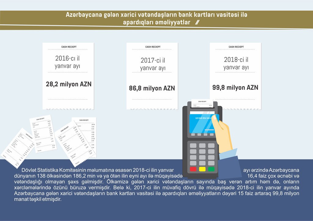 Belə ki, 2017-ci ilin müvafiq dövrü ilə müqayisədə 2018-ci ilin yanvar ayında Azərbaycana gələn xarici vətəndaşların bank kartları vasitəsi ilə apardıqları əməliyyatların dəyəri 15 faiz artaraq 99,8 milyon manat təşkil edib.