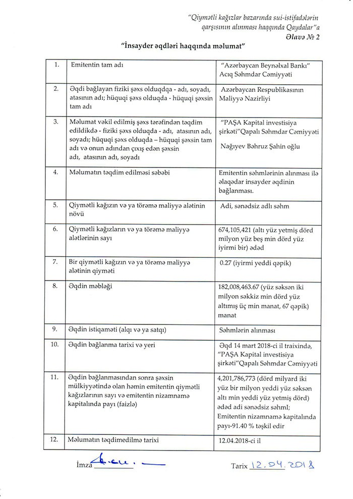 "Marja" xəbər verir ki, əqd, "PAŞA Kapital" İnvestisiya Şirkətinin vasitəsilə 14 mart 2018-ci il tarixində bağlanıb.