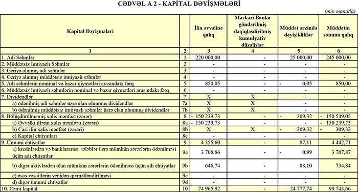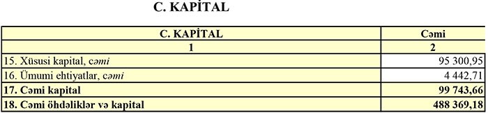 Bank ötən ilin sonunda 437 milyon 330 min manat cəmi aktivlərə, 362 milyon 364 min manat cəmi öhdəliklərə və 74 milyon 966 min manat cəmi balans kapitalına malik idi.