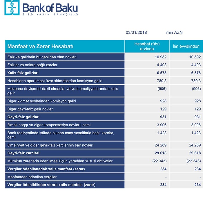 2017-ci ilin 1-ci rübünü 3 milyon 538 min manat zərər ilə bağlamış “Bank of Baku” 2018-ci ilin 1-ci rübünü 234 min manat xais mənfəət ilə başa vurub.