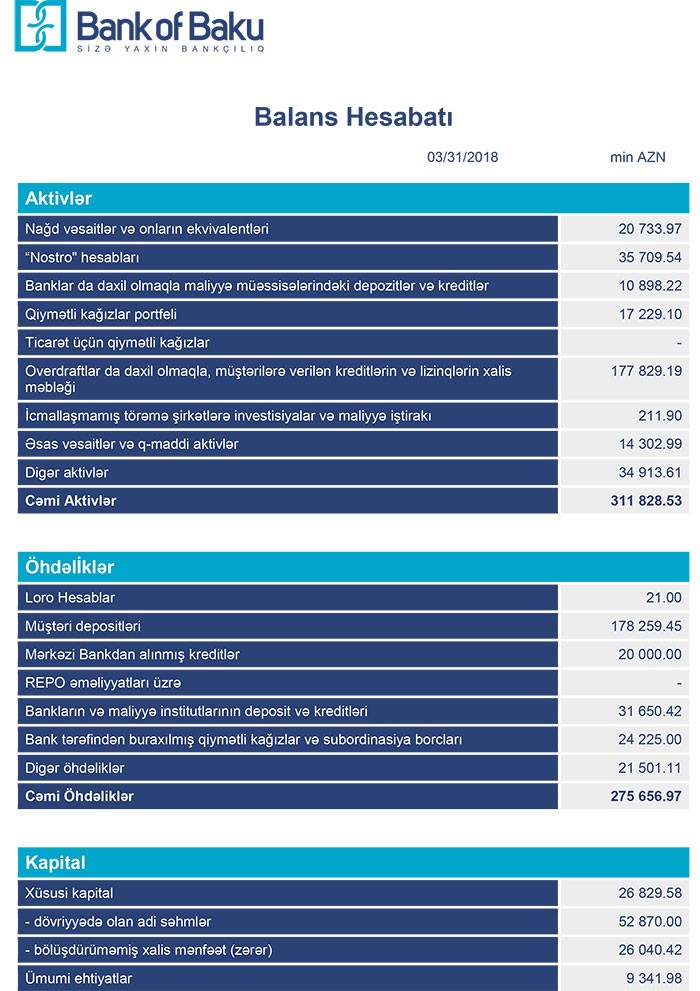 31 Mart 2018-ci il tarixində “Bank of Baku” ASC 311 milyon 828 min manat cəmi aktivlərə, 275 milyon 656 min manat cəmi öhdəliklərə və 36 milyon 171 min manat cəmi balans kapitalına malik olub.