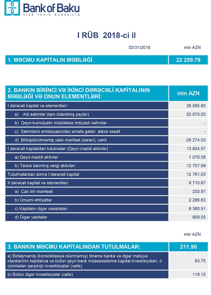 31 Mart 2018-ci il tarixində “Bank of Baku” 22 milyon 259 min manat məcmu kapitala malik olub.