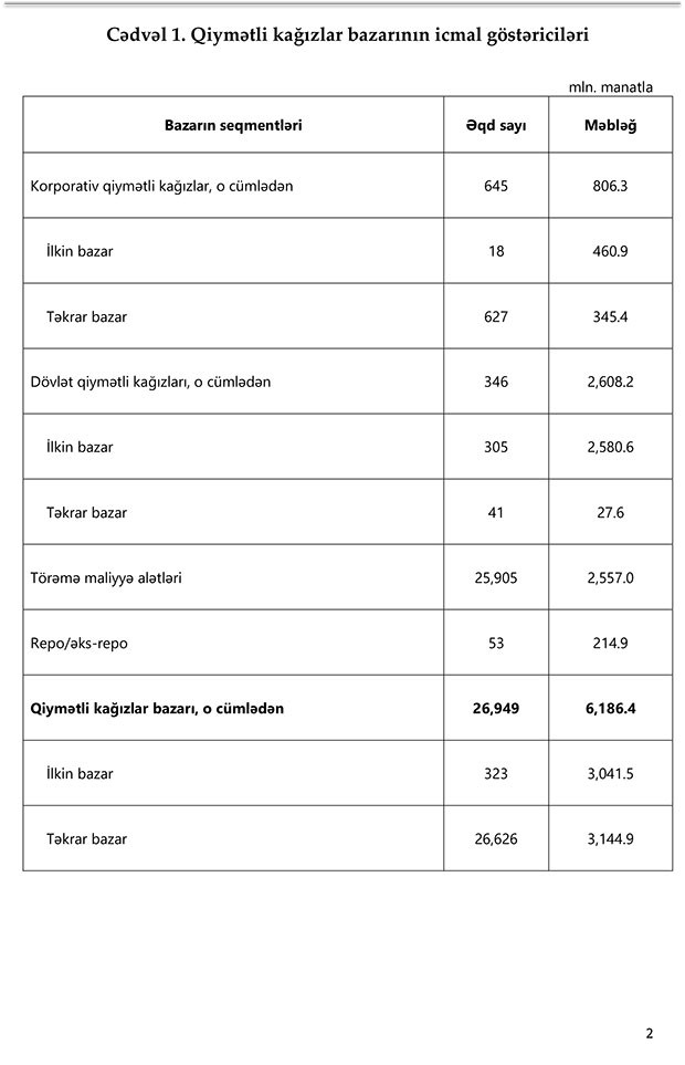 2018-ci ilin I rübü ərzində qiymətli kağızlar bazarında 6.2 mlrd. manat həcmində əməliyyat aparılmışdır ki, bu da ötən ilin müvafiq dövrü ilə müqayisədə 2.7 dəfə çoxdur. Əməliyyatların 48%-i (3 mlrd. manat) ilkin bazarda, 52%-i (3.2 mlrd. manat) isə təkrar həyata keçirilmişdir.