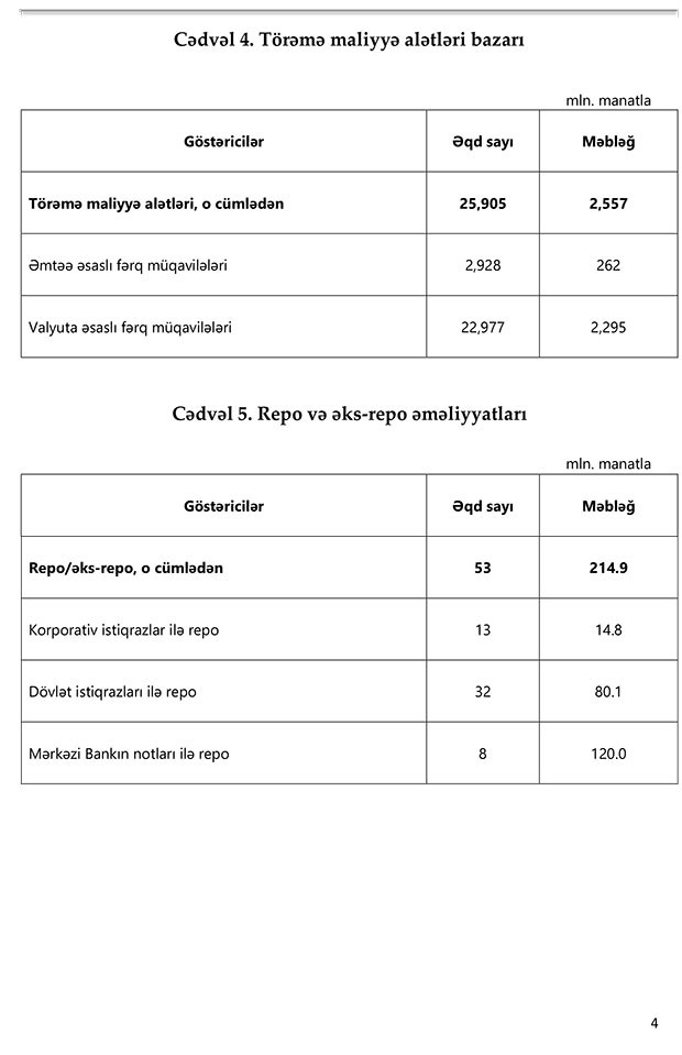 2018-ci ilin I rübü ərzində ötən ilin müvafiq dövrü ilə müqayisədə 79 dəfə daha çox repo əməliyyatları aparılmışdır. Hesabat dövrü ərzində həyata keçirilmiş repo əməliyyatlarının həcmi 215 mln. manat (56%-i və ya 120 mln. manat Mərkəzi Bankın notları ilə) olmuşdur.