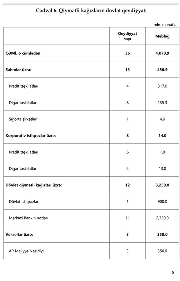 Korporativ istiqrazlar üzrə isə 14 milyon manatlıq 8 emissiya dövlət qeydiyyatına alınıb.