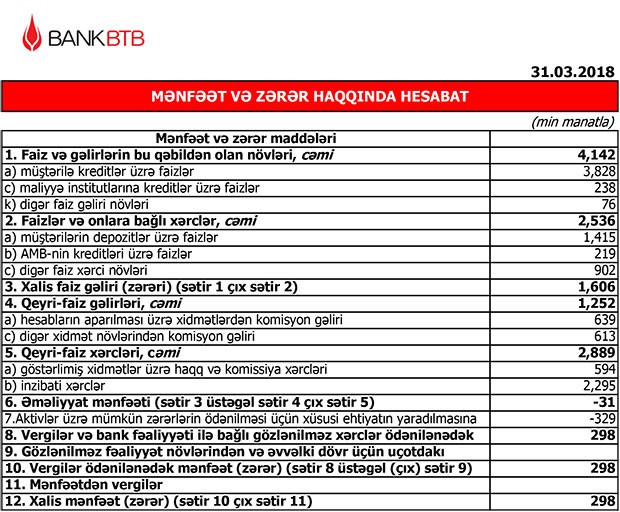 “Bank BTB” ASC 2018-ci ilin 1-ci rübünü 298 min manat xalis mənfəət ilə başa vurub. Müqayisə üçün qeyd edək ki, Bank 2017-ci ilin 1-ci rübünü 1 milyon 144 min manat xalis zərər ilə bağlamışdı.