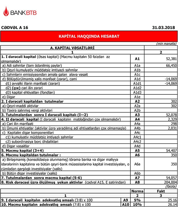 31.03.2018-ci il tarixində “Bank BTB” 54 milyon 57 min manat məcmu kapitala malik olub.
