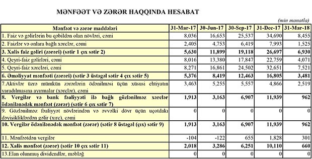 Bankın əməliyyat mənfəəti 2017-ci ilin ilk rübündəki 5 milyon 376 min manatdan 2018-ci ili ilk rübündə 3 milyon 481 min manata geriləyib. Bank əməliyyat mənfəətinin 2 milyon 519 min manatı ehtiyatlara ayırıb. Qalan 962 min manat mənfəətdən 301 min manat mənfəət vergisi ödənilib.