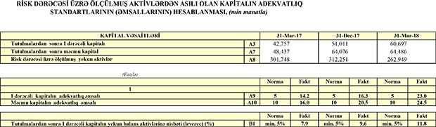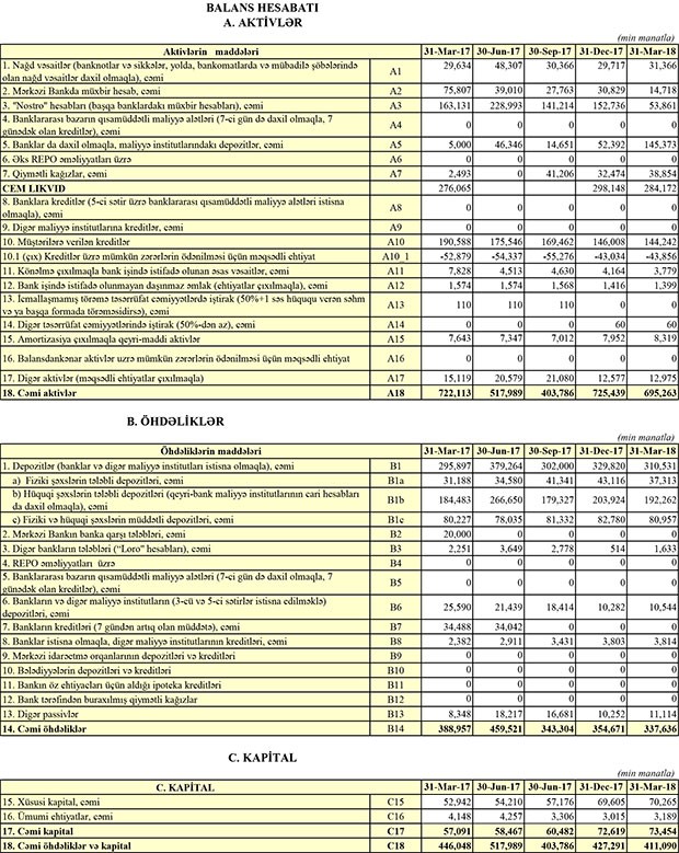 Bankın öhdəlikləri isə ötən ilin sonundakı 354 milyon 671 min manatdan 31 Mart 2018-ci il tarixində 337 milyon 636 min manata geriləyib.