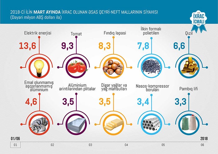 Dövlət Statistika Komitəsinin məlumatına əsasən cari ilin mart ayında isə qeyri-neft sektoru üzrə ixrac 115 milyon ABŞ dolları təşkil edib. 2018-ci ilin mart ayında ən çox qeyri-neft sektoruna aid mal Türkiyəyə ixrac edilib(42,3 milyon ABŞ dolları). 2018-ci ilin mart ayında qeyri-neft sektoru üzrə ixracda birinciliyə elektrik enerjisi sahiblənmişdir(13,6 milyon ABŞ dolları). Bu siyahıda ikinci yeri tomat (9,3 milyon ABŞ dolları), üçüncü yeri isə qabığı təmizlənmiş meşə fındığı (8,3 milyon ABŞ dolları) tutub.