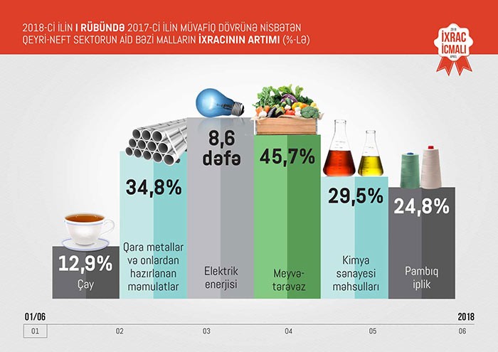 2017-ci ilin müvafiq dövrü ilə müqayisədə 2018-ci ilin I rübündə elektrik enerjisinin ixracı 8,6 dəfə, meyvə-tərəvəzin ixracı 45,7 faiz, qara metallar və onlardan hazırlanan məmulatların ixracı 34,8 faiz, kimya sənayesi məhsullarının ixracı 29,5 faiz, pambıq ipliyi ixracı 24,8 faiz, çayın ixracı 12,9 faiz, alüminium və ondan hazırlanan məmulatların ixracı 4 faiz artıb.