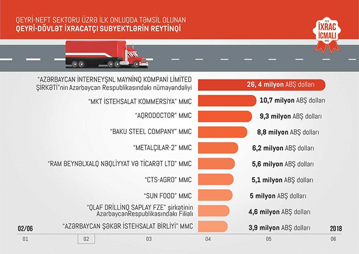 İcmalın bu sayında göstərilir ki, 2018-ci ilin I rübü ərzində qeyri-neft sektoru üzrə ixrac 356,4 milyon ABŞ dolları təşkil edib. 2017-ci ilin müvafiq dövrü ilə müqayisədə cari ilin yanvar-mart aylarında qeyri-neft sektoru üzrə ixrac 35 faiz artıb.